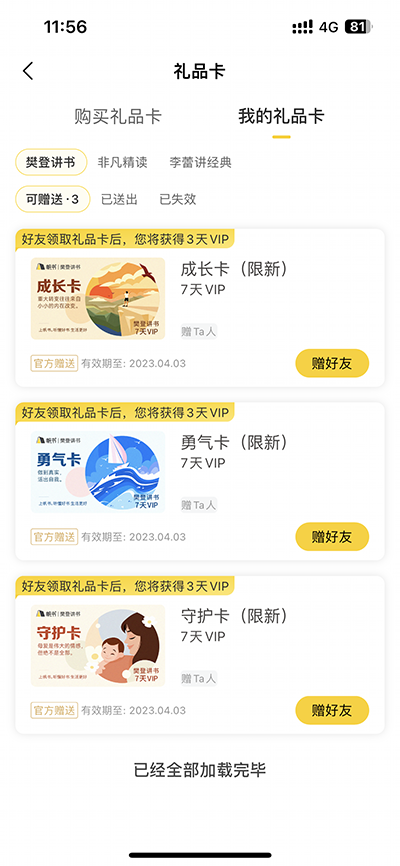 (2)第二种办法就是你身边是否有帆书会会员,如果有节假日,会针对这些会员,赠送亲情卡,或者礼品卡,有15天或者7天的,这个主要是可以赠送朋友的,自己也用不了,你可以要过来。