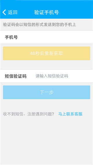 1、填写好真实的手机号码后,点击“获取短信验证码”按钮,系统会给您手机发送一条包含4-6位验证码的手机短信。如果点击之后,在60秒后仍然没有接收到短信,可以再次点击获取,多次尝试后还是无法接收的,有可能是您的手机号被运营商列入黑名单了,您可以联系我们客服进行解封处理。