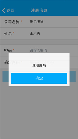 3、填写公司或商户信息,注册成功后系统会提示“注册成功”,点击确认之后跳转到登录页面。
