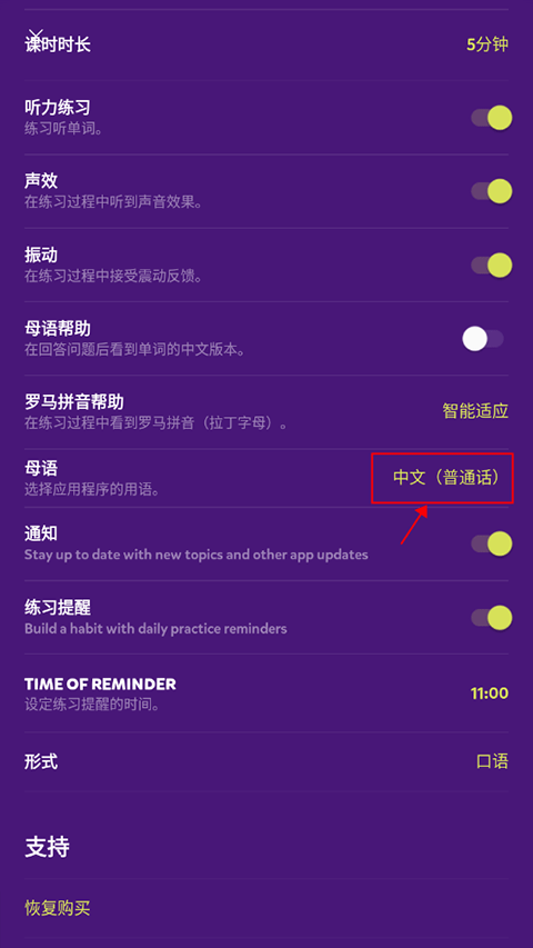 2、在语言界面选择你想学习的语言,点击即可切换。