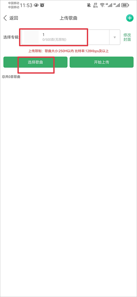 4、然后在上传歌曲的界面中选择刚刚创建的专辑名称,选择后点击选择歌曲