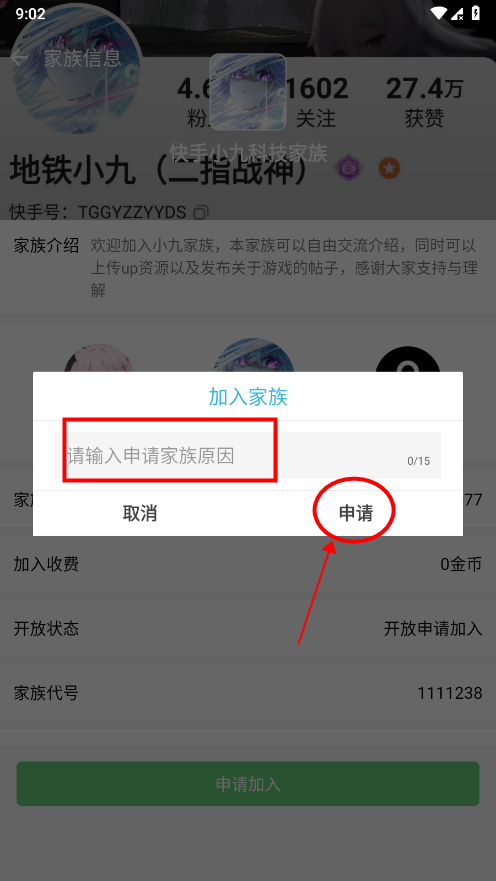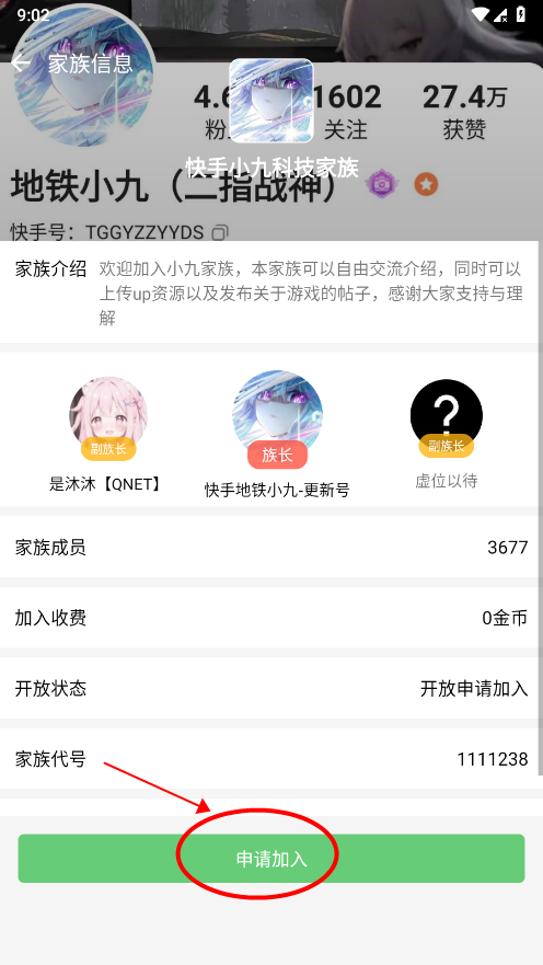 在家族信息页面,点击申请加入;