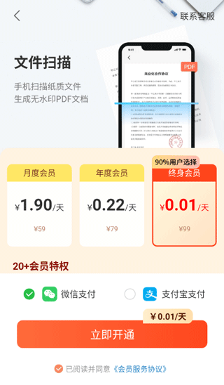 每天0.01元意思是说明费用很便宜,每天仅需1分钱,不管是月度会员,还是年度会员、终身会员,开通后均所有功能都可使用,不需要再额外付费。