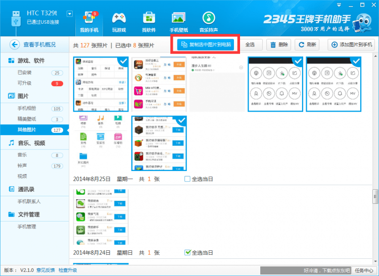 步骤2:进入“照片”,选择您想要保存到电脑的图片,然后选择“复制选中图片到电脑”。如下图: