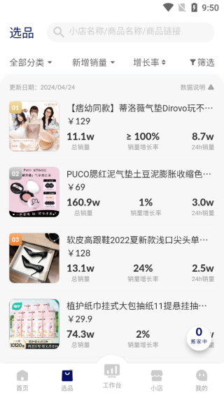 3、选品专区可以查看到各类商品的销量增长率,帮助用户掌握市场