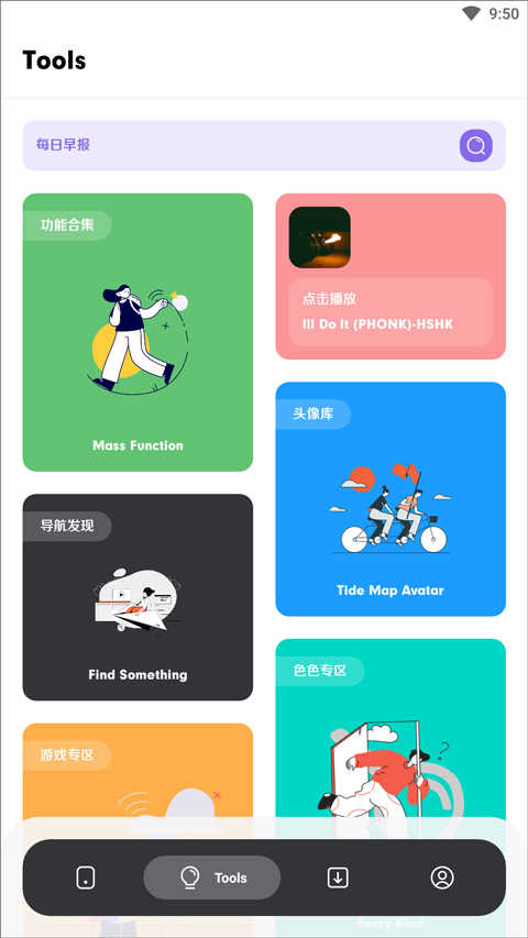 5、点击下方灯泡按钮Tools,可以发现里面有着众多特色功能,如音乐、游戏等;