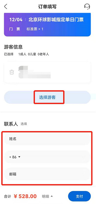 3、选择/添加游客信息(包括姓名、身份证号),并填写联系人信息,支付订单即可