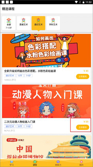1、同样还是切换到【课程】这个页面,它分为思维艺术、通识艺术、学科艺术这三个方面。选择其中一类并选择你要报名的课程。