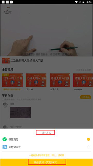 3、观看好后,就可以选择支付方式并确认支付。购买课程之后你的小孩还可以实时上传自己的作品,让老师指点一下。