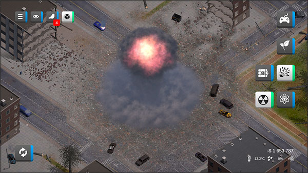 后期尝试组合玩法——用风暴先吹散车辆,再用激光精准切割摩天大楼;或召唤怪兽横冲直撞,观察不同地形下的破坏连锁反应。挑战模式可追求最高摧毁分数,比较不同武器的效率。注意能量管理,优先用低耗工具清场,再放大招收尾。