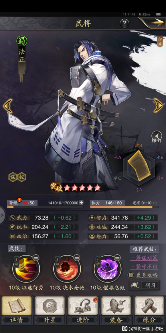 3、挑选出成长属性和技能较好的五星将出来,和徐庶,潘凤(三星将但是统御只有2,所以经常用来凑份子)一起组成人队,狂升主武技,征满兵去打三级地,七级后去锤四级地,十五级后,直接去锤五级地!