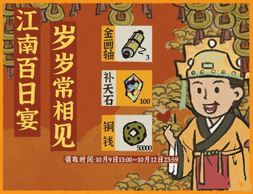 再就是百日庆福利时间!只要在10月9日13:00—10月12日23:59期间登录就能领取百日庆的贺礼,金画轴*3、补天石*100、铜钱*50000。