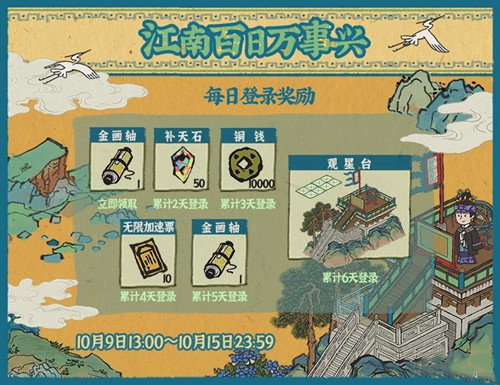 还有百日万事兴登录奖励,在10月9日13:00—10月15日23:59期间。每天登录就能领取补天石、金画轴、无限加速票、以及全新建筑【观星台】。