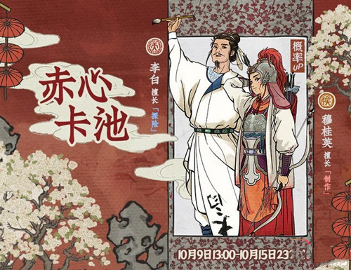 最后,赤心卡池UP啦,10月9日13:00—10月15日23:59期间,李白(天级),穆桂英(候级)角色都会进入赤心卡池,限时概率up,想入手的小伙伴们可不要错过了哦!